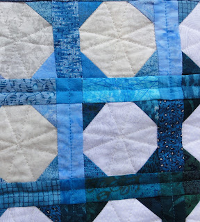 I did something with this quilt that I prefer not to do. After finishing the top, I started another project before completing this one. I decided that it needed to sit and percolate before the quilting process. The concept was okay but I'm not all that comfortable working with pastel floral with high contrast fabrics; therefore I struggled with balancing the color placement. It is now finished hoping the quilting redeems it!